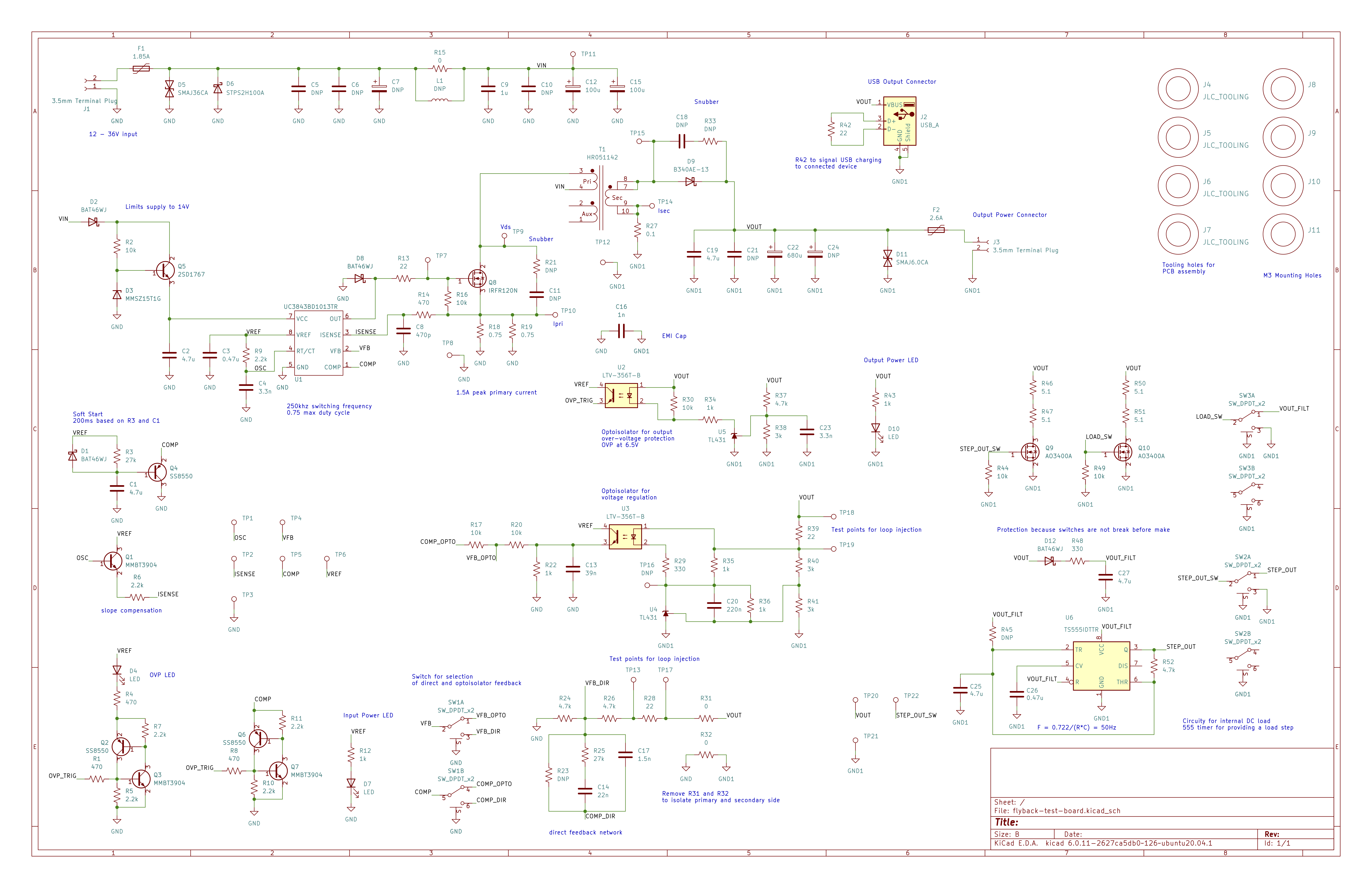The flyback test board was designed in kicad. The github repo containing the kicad design files and an annotated PDF schematic is here. The components on the test board are well labeled and the PDF schematic should be sufficient for the labs but it is highly recommended you try downloading kicad and looking at the PCB layout. The schematic is also provided in (Figure 1.3).