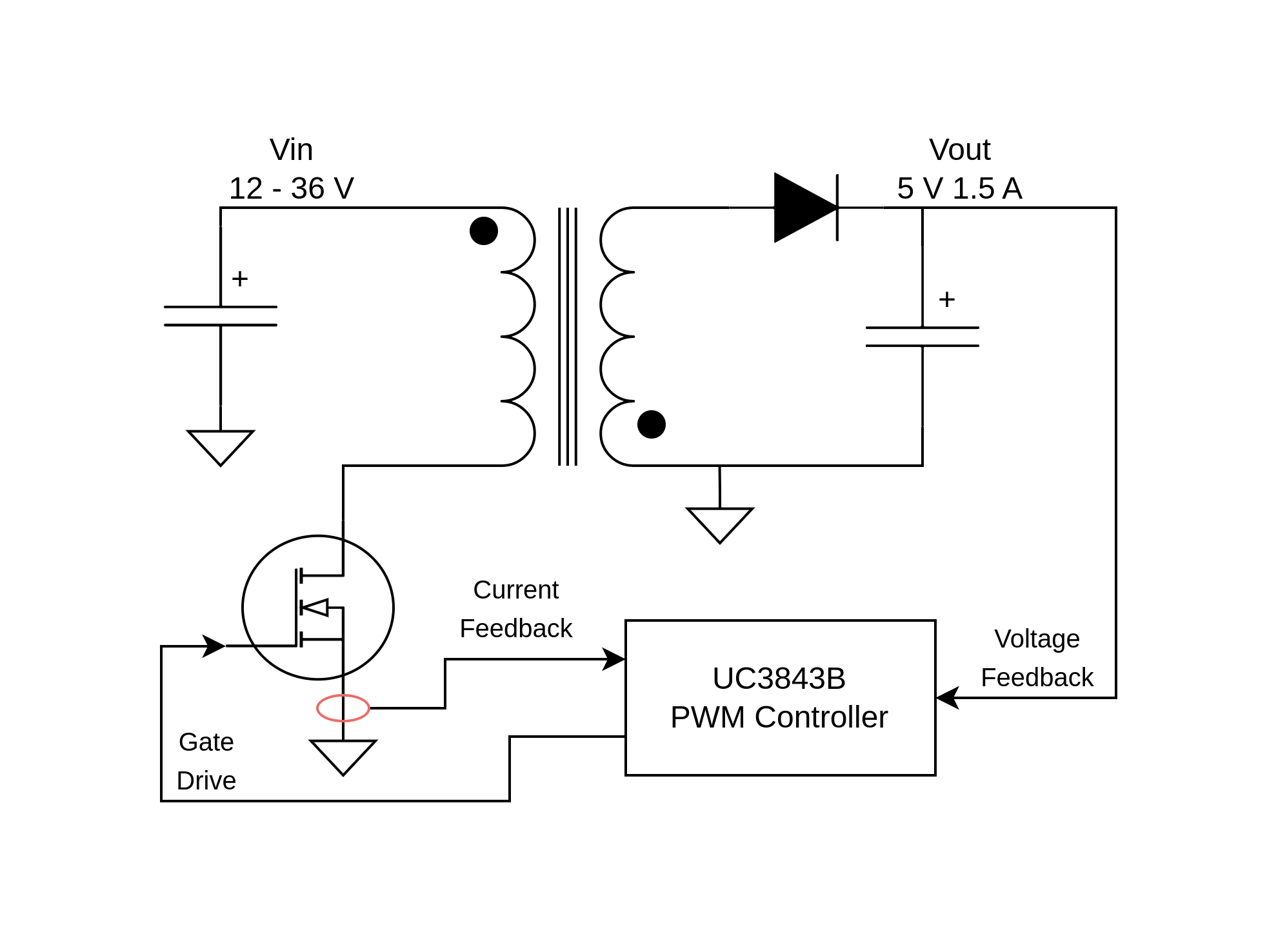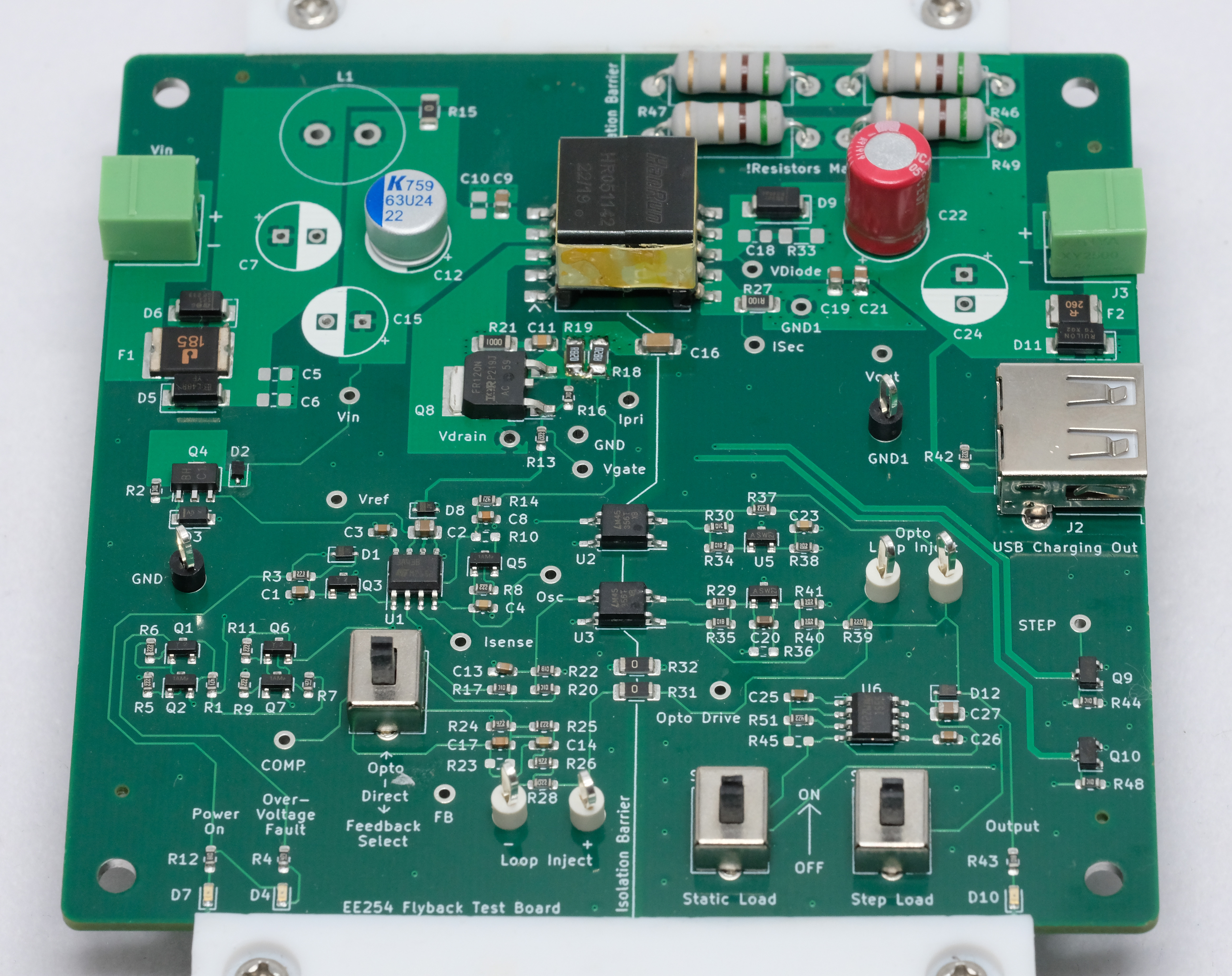 The labs for this class are based on the EE254 flyback test board, shown in Figure 1.1. The board accepts a 12-36V DC input and provides a regulated 5V output which capable of charging a phone through the USB-A connector. As a flyback converter this board is similar to the flyback converter you built in EE153/253. Figure 1.2 shows a simplified diagram of the test board. Compared to the flyback converter you built in EE153/253, this board has a control loop to regulate the output voltage as well as added test points, protection circuity, and a small DC load, to make work with the board easier.