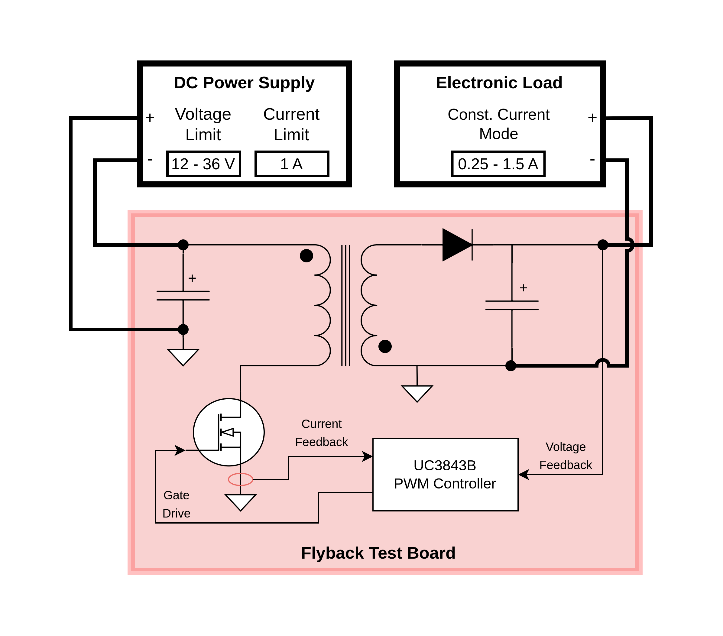 For all of the parts of this lab set the DC power supply to current limit of \(1~A\). If you set the current limit too low the power supply may power cycle when you load the flyback converter, if you set the current limit too high it increases the risk you damage the board if you accidentally short something out.