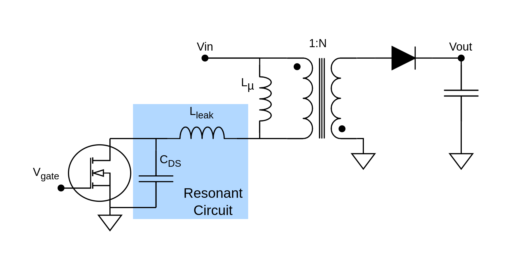 The cause of ringing in switching waveforms is typically due to parasitic, or unwanted, circuit elements. In the flyback converter the ringing on turn-off is between the drain to source capacitance of the MOSFET, \(C_{DS}\), and the leakage inductance of the transformer, \(L_{leak}\). When the power MOSFET in the flyback converter is on, energy is transferred to the magnetizing inductance of the transformer, \(L_\mu\). When the MOSFET turns off, the energy in the transformer commutates the rectifier diode and delivers power to the output. However, the energy stored in the \(L_{leak}\) is not coupled to the output and oscillates with \(C_{DS}\). Figure 4.3 shows the flyback converter with these parasitic components shown as well as the small signal model with the RC snubber added. As the MOSFET is off and the diode is an AC short across the transformer secondary both the MOSFET symbol and the transformer are removed from the small signal model and do not impact the oscillation.