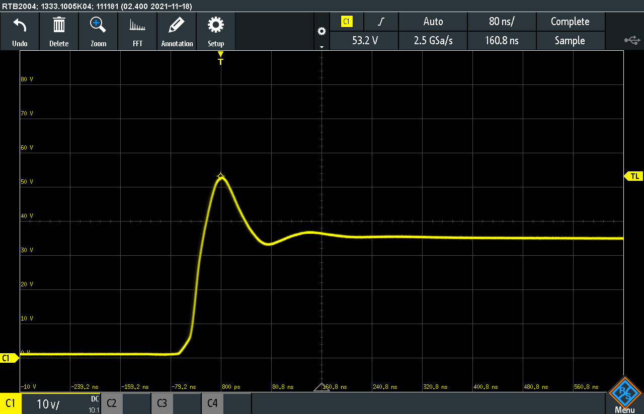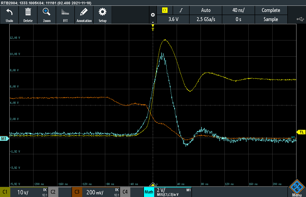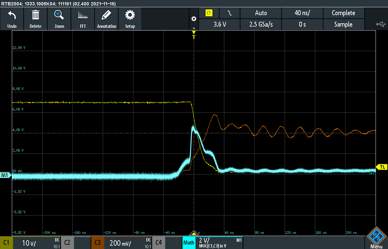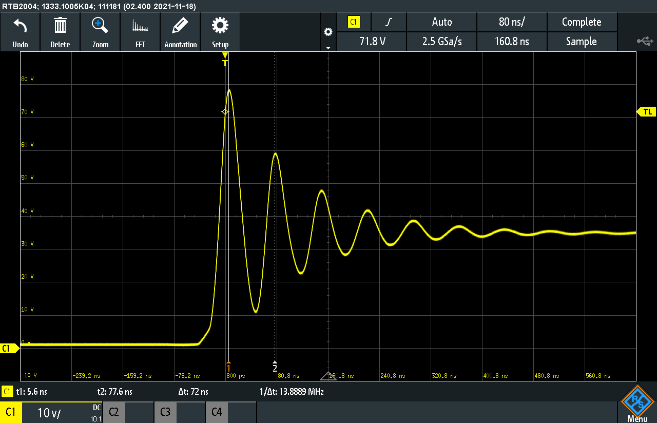 - With \(C_{snub}\) (C11) and \(R_{snub}\) (R21) not installed measure the frequency of the ringing on \(V_{DS}\) during turn-off, \(f_1\). Use the oscilloscope cursors to help you measure the ringing frequency. Save an oscilloscope screenshot for your lab submission.
