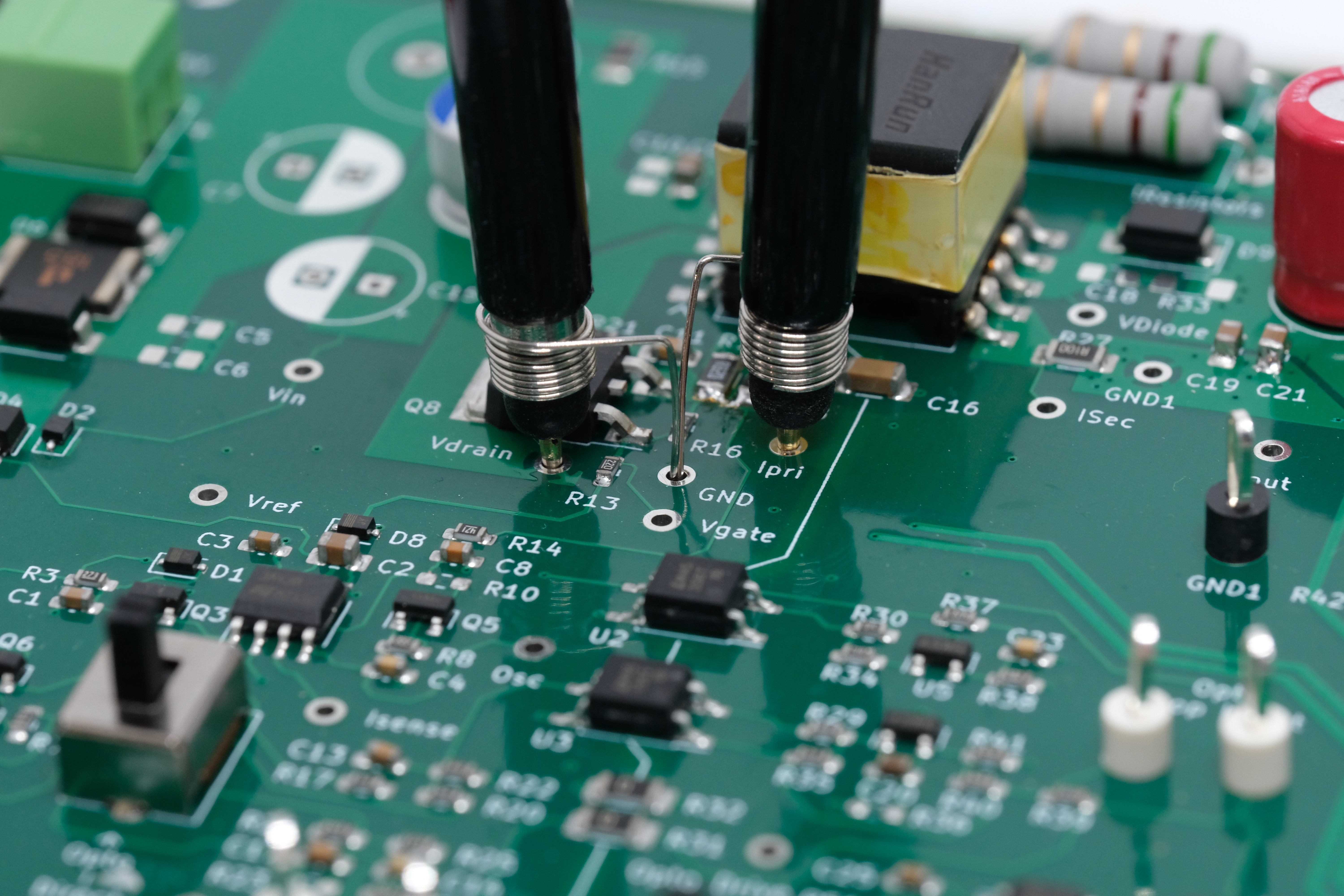 In this portion of the lab you will measure switching loss when the power MOSFET in the flyback converter turns on and off. This can be done by using the oscilloscope to measure the MOSFET drain to source voltage, \(V_{DS}\), and drain current, \(I_D\), during the switching transitions. \(V_{DS}\) can be measured at the “Vdrain” test point on the test board while \(I_D\) can be measured at the “Ipri” test point, which connects to two parallel \(0.75~\Omega\) resistors between the MOSFET source and ground. These shunt resistors are used by the controller IC to regulate the MOSFET current but for this test setup it can be used to measure the MOSFET current without a dedicated current probe.