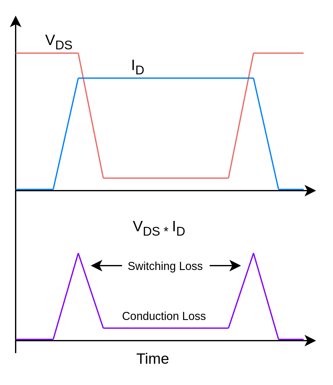The power MOSFET is not an ideal switch. The device has an on-resistance which causes a power dissipation of \(I^2R_{on}\) when conducting current. When the device is off the current flow is small enough such that losses can typically be considered negligible. The on resistance is an important parameter in calculating the loss in the power MOSFET, and in EE153/253 you measured the on-resistance of devices and used those values to calculate loss. However, there is another loss that is significant in power electronics applications: Switching Loss.