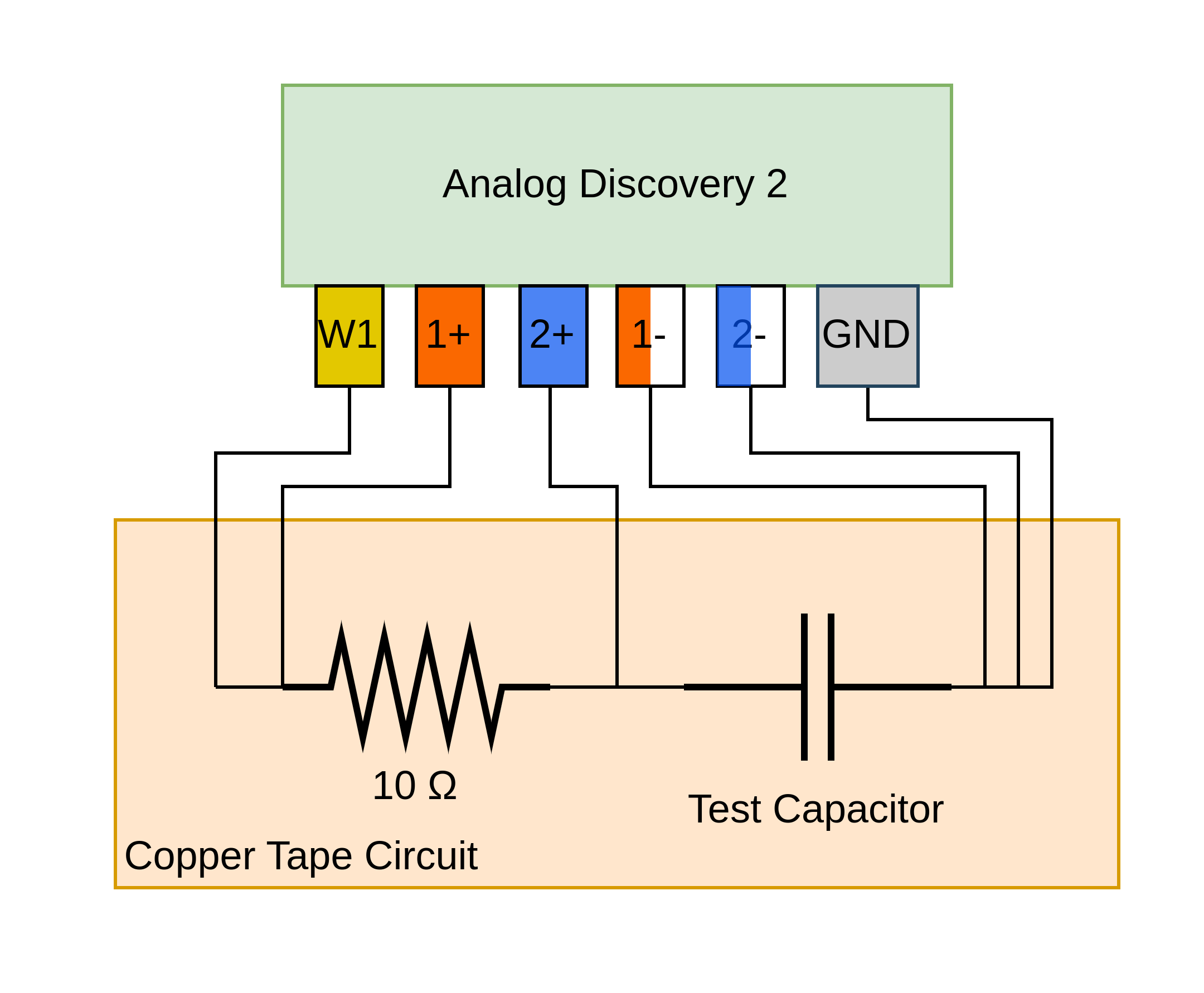 For these measurements you are going to be using the impedance analyzer portion of the WaveForms software. Measurements are made by connecting a known value resistor in series with the capacitor, creating a voltage divider, and applying a frequency sweep with the Analog Discovery 2 (AD2) waveform generator. The oscilloscope channels of the AD2 are used to measure the amplitude and phase of the voltage and the impedance is derived from the reference of the known resistor value. You are going to be soldering the resistor, capacitors to be tested, and wire loops for the AD2 test clips, as a copper tape circuit. Figure 4.3 shows the diagram of the circuit along with the color coded AD2 test leads. In taking your measurements try to connect the test leads for channel 2 as close to either side of the capacitor as possible, as any leads or copper tape between the capacitor and the test leads will contribute to the measured ESR. As the applied voltage is low you do not need to worry about the polarity of the electrolytic capacitors.