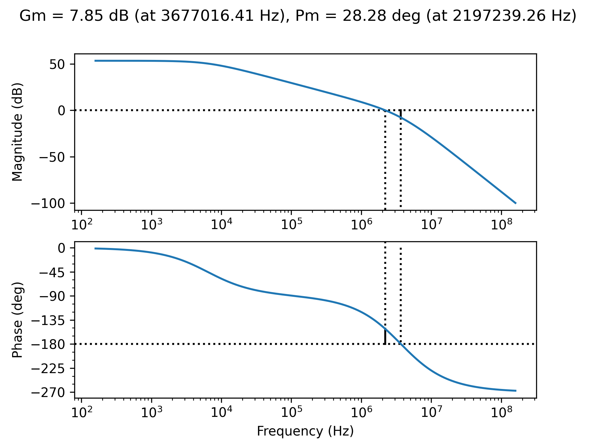 The second python script system_tf.py requires the values of \(K\), \(\omega_1\) and \(\omega_2\), extracted by the first script. Replace the placeholder values at the top of the script with the values you extracted. You will be changing the value of load capacitance defined at the top of the script and seeing how that impacts the phase margin. This script models the open loop transfer function of the TL431 and load and generates and saves a plot of the open loop transfer function with the crossover frequency marked and the phase margin calculated. Figure 4.12 shows an example output.