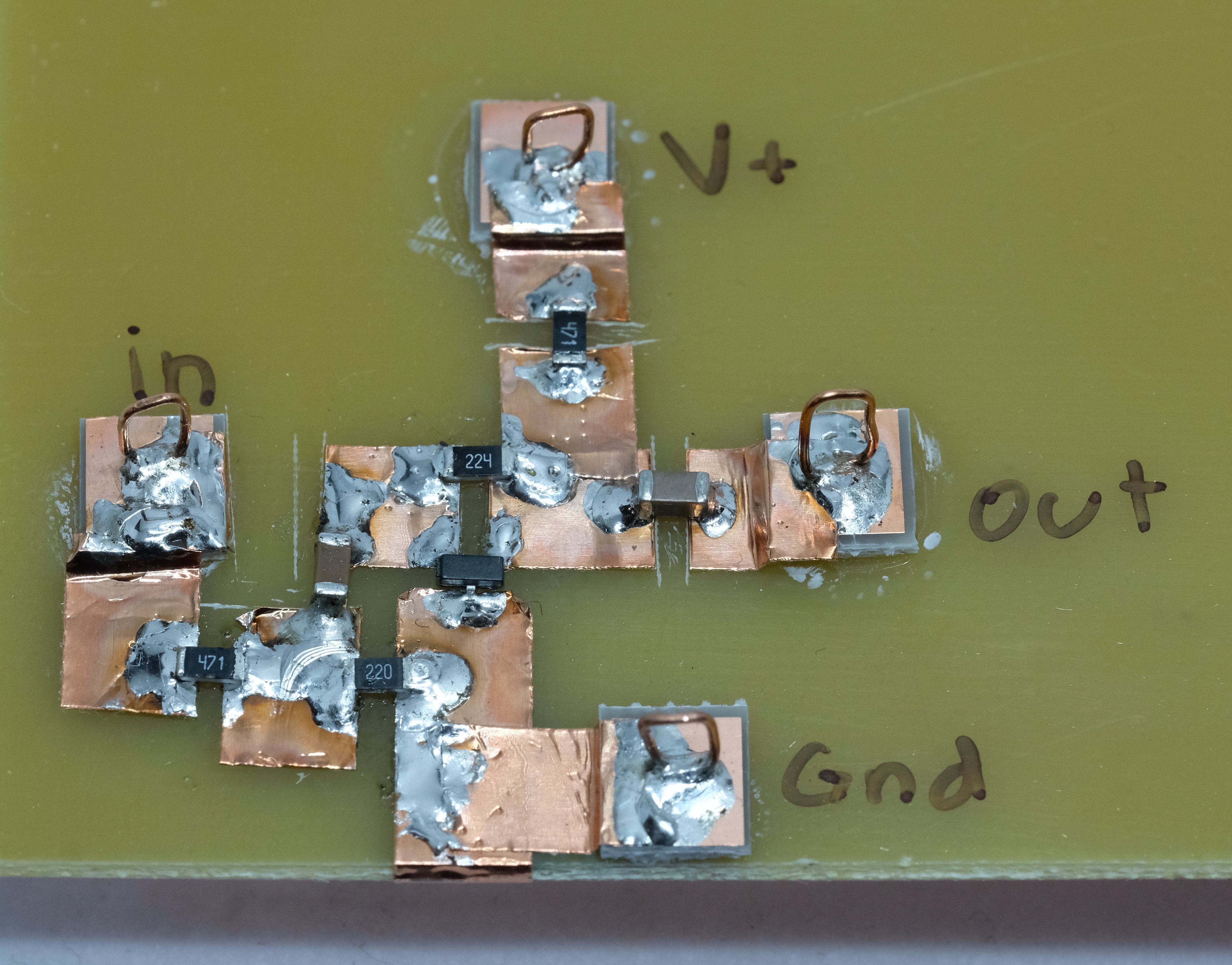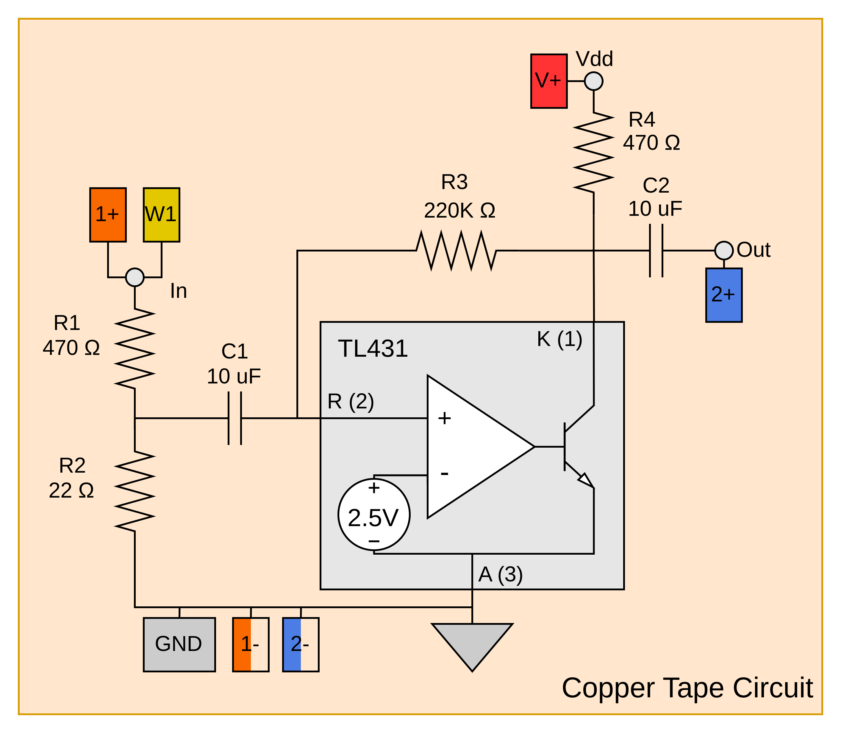 For this lab you are going to be constructing two copper tape circuits. One circuit, shown in Figure 4.9, will be used to measure the open loop gain of the TL431. The open loop gain of devices with high DC gain can be difficult to measure because any input offset voltage can saturate the output and lead to inaccurate measurements. Typically some sort of low frequency feedback is used to stabilize the system at DC. The circuit you will be using to measure the open loop gain uses \(R_3\) to provide feedback at DC and the feedback is low-pass filtered by \(C_1\). Given the expected low frequency gain of the TL431, the component values will allow for accurate measurement of the open loop gain of the TL431 down to a frequency of \(\approx 500 ~\text{Hz}\), which is signifigantly below \(\omega_1\) and \(\omega_2\).