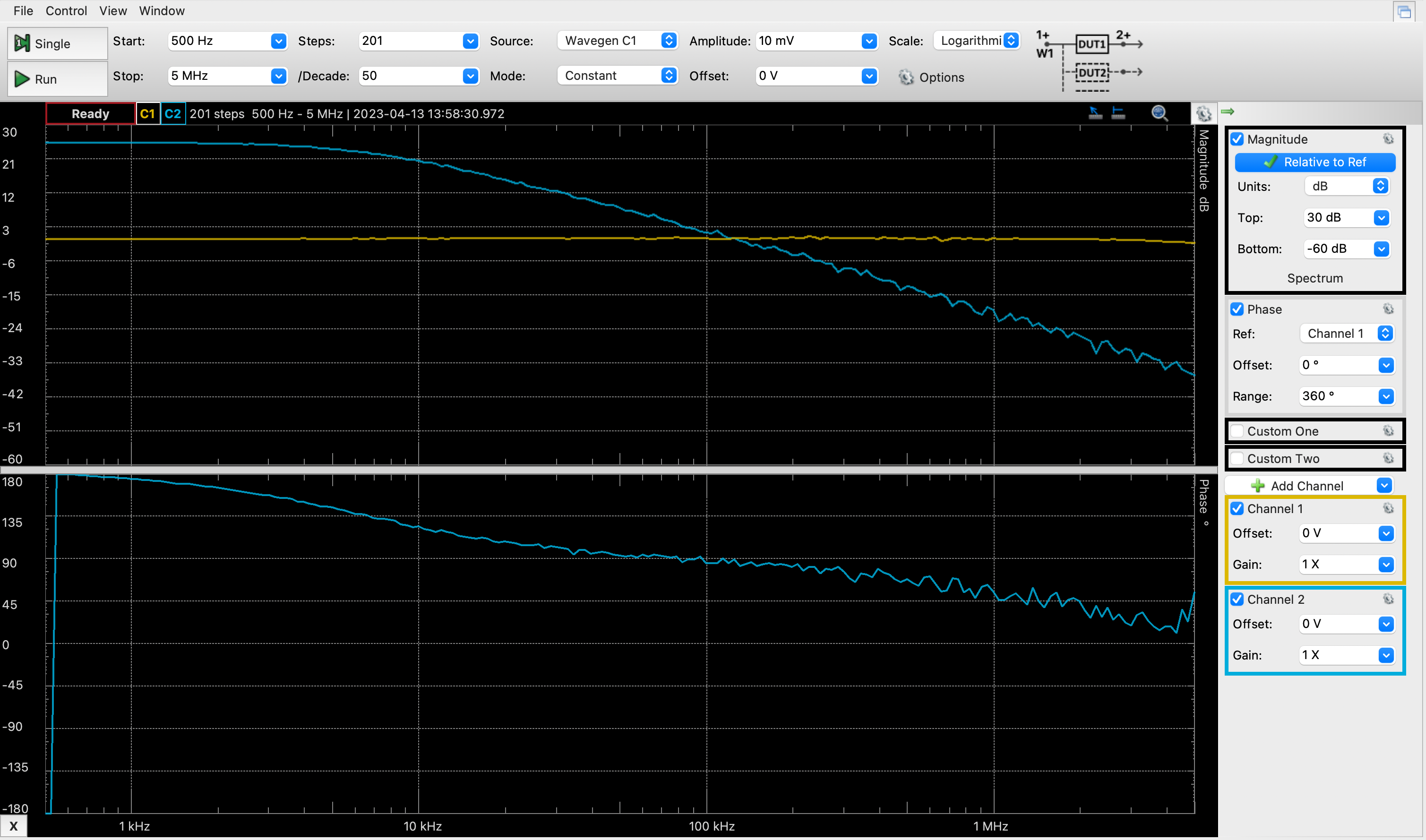 Figure 4.11 shows the Network view in WaveForms along with the correct settings to use and a completed sweep of the TL431. C2 (in blue) represents the transfer function of the system normalized to C1, which measures the input amplitude. The top plot shows gain in dB and the bottom plot shows phase in degrees. To collect enough data to accurately extract the DC gain and frequencies of the two poles, sweep from 500 Hz to 5 MHz. Set the amplitude to 10 mV to avoid saturating the TL431 at low frequencies where gain is high. If you do not manually adjust the displayed magnitude range your measurements may extend beyond the Y axis. There can be variation in the the open loop gain and frequencies of the poles between parts, but your measurements should appear broadly similar.