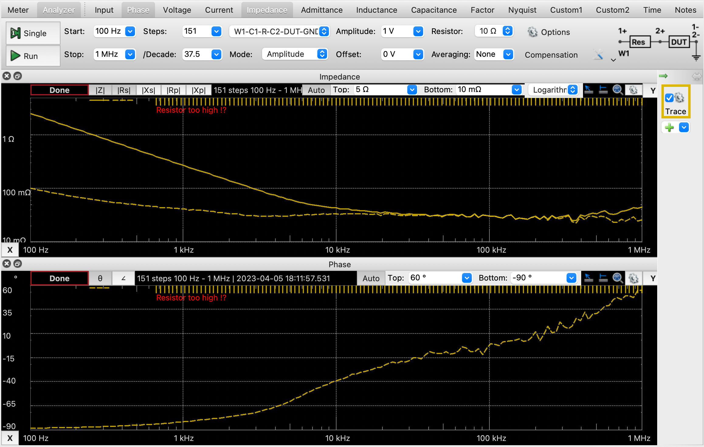 For settings in the impedance analyzer view of the WaveForms software make sure that the measurement mode is “W1-C1-R-C2-DUT-GND”. Use a frequency range of 100 Hz - 1 MHz and an amplitude of 1V. Figure 4.4 shows a screenshot of the settings and example data. A warning of “Resistor too high !?” is to be expected and is due to the low values of ESR being measured. If the channel 2 test clips are connected close on either side of the capacitor the measurements should still be accurate.