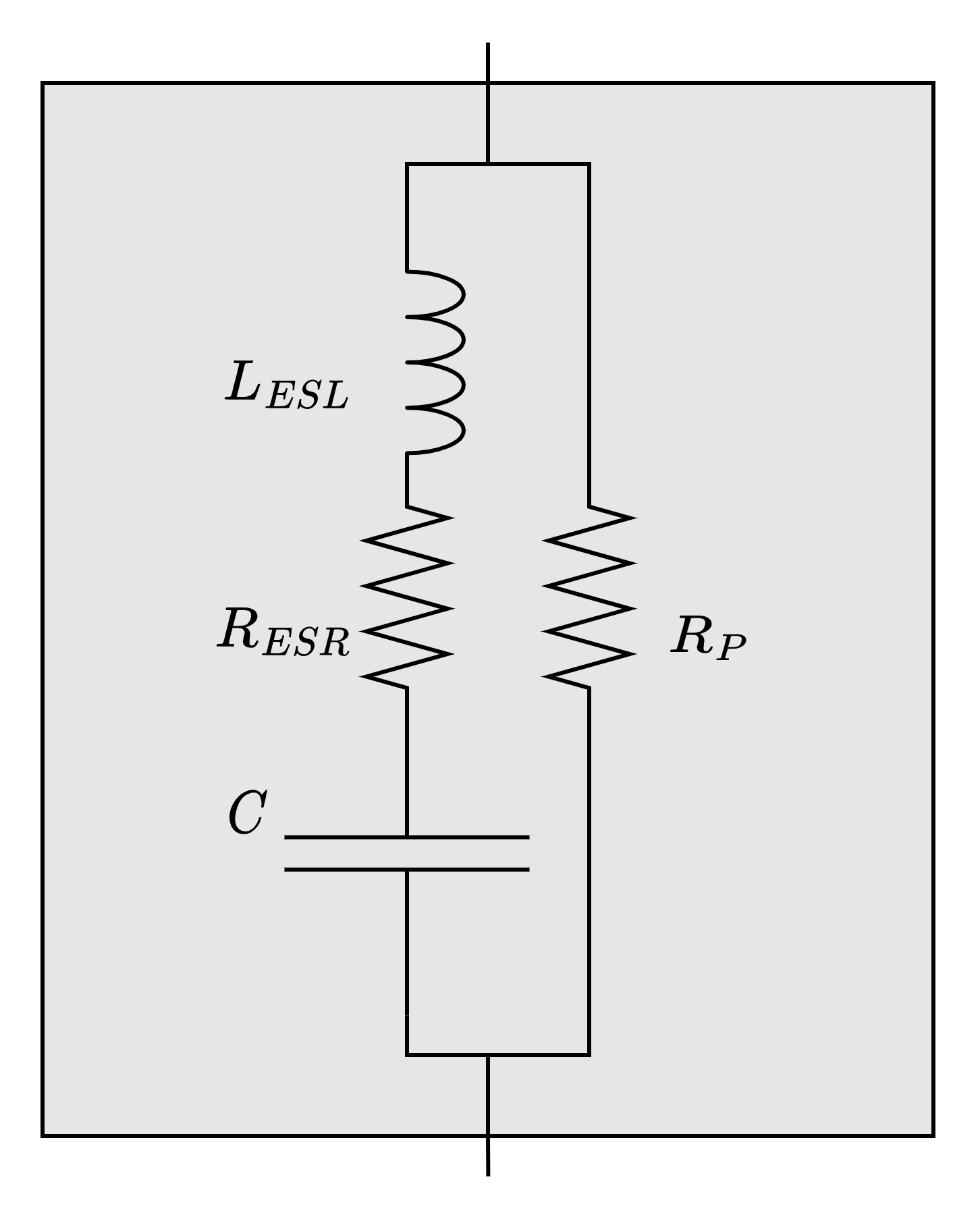 Electrical components are not ideal and sometimes these non-idealities lead to significant disparities between simulated and measured behavior. Understanding these non-idealities is often important in circuit design, especially so in power electronics. Figure 4.1 shows the capacitor model with all of the typically considered parasitic circuit elements. \(R_{ESR}\) is the equivalent series resistance (ESR), \(L_{ESL}\) is the equivalent series inductance (ESL), \(C\) is the nominal capacitance, and \(R_P\) modeled capacitor leakage. Capacitor ESR is determined by the electrode resistance and dielectric loss of the capacitor. ESL represents the inductance of the capacitor electrodes and leads and is largely determined by the geometry of the capacitor. In power electronics the ESR and ESL of the capacitor are typically the most relevant. Both ESR and ESL reduce the ability of the capacitor to filter transients and ESR drives \(I^2R\) loss that reduces efficiency and can lead to the capacitor over-heating.