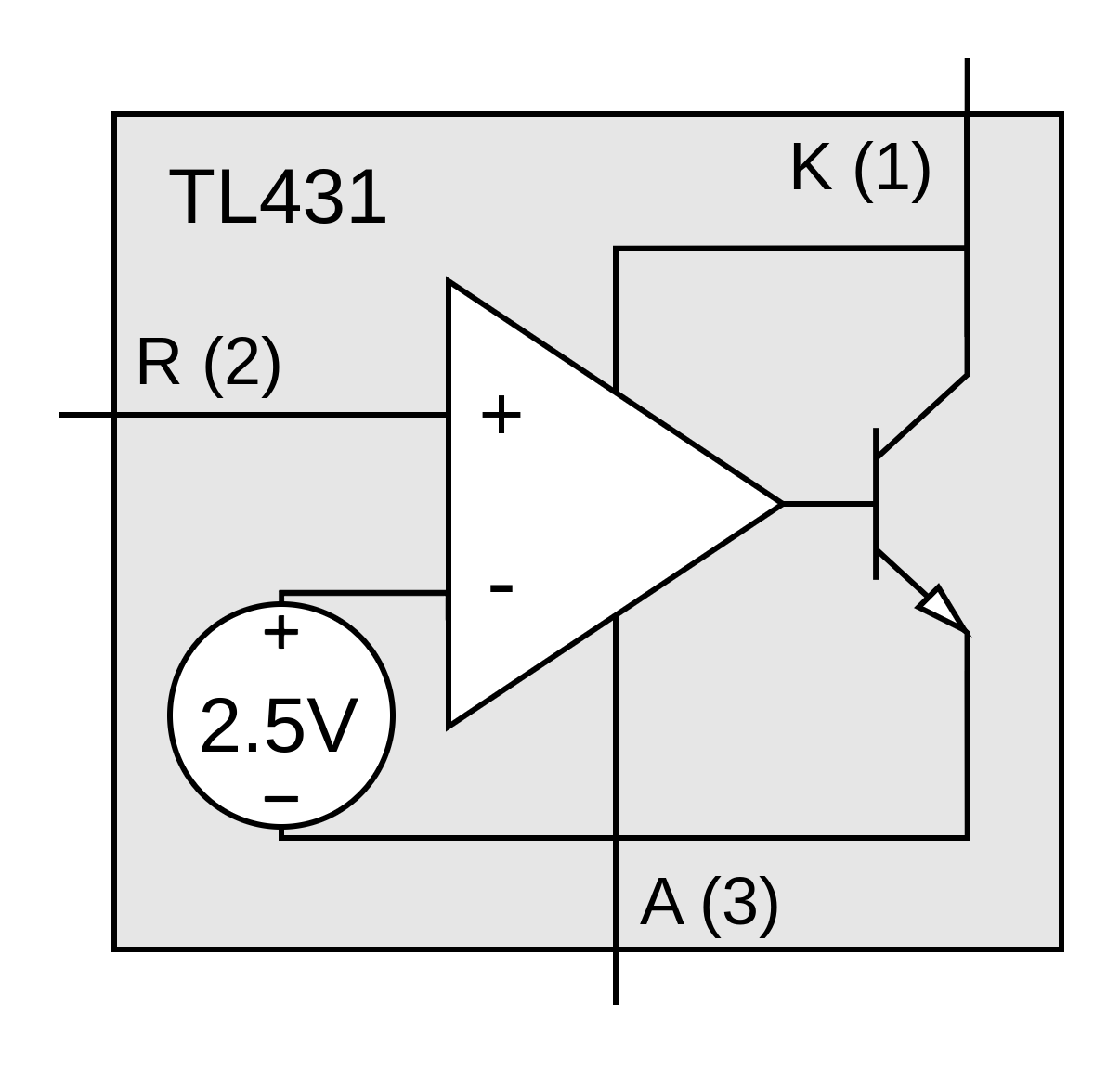 Datasheets for the TL431 typically call the device a shunt regulator, but is an incredibly versatile and widely used IC that only costs a few cents in volume. Just a few of the possible uses of the TL431 are as a linear regulator, comparator, amplifier, or voltage reference. In one of the largest commercial uses the TL431 is used for regulation on the secondary side of isolated switch-mode power supplies to drive an opto-coupler that controls the power stage on the primary side. A diagram of the internal circuitry of the TL431 is shown in Figure 4.6. The TL431 is a three terminal device containing an op-amp and voltage reference and is powered through the output (cathode) pin. The reference terminal (R) is connected to the positive input of the internal op-amp and the internal 2.5V reference is connected to the negative input of the op-amp. The op-amp drives the base of an internal NPN transistor which is used to sink current from the cathode pin (K) from which the IC also pulls it’s operating power. The anode pin (A) is the negative reference point for the internal circuitry.