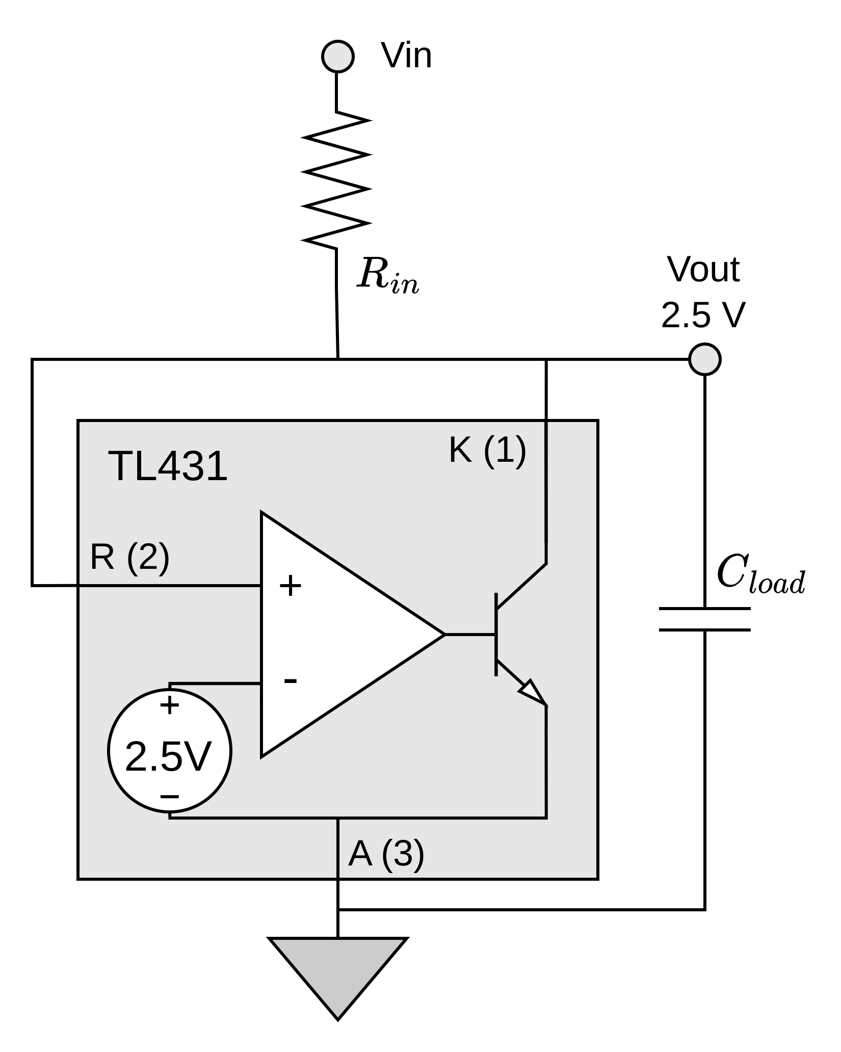 In applications with closed loop regulation the TL431 sinks current through the cathode pin to maintain the voltage on the reference terminal at \(2.5~V\). This lab will be analyzing the TL431 as a shunt voltage regulator and the impact of an output capacitor, \(C_{load}\). The schematic of this configuration is shown in Figure 4.7. In this configuration the cathode and reference pins are connected together and to the positive supply rail through \(R_{in}\) and regulated at \(2.5~V\). A voltage divider can be added between the cathode and reference pin to generate an output voltage greater than \(2.5~V\).