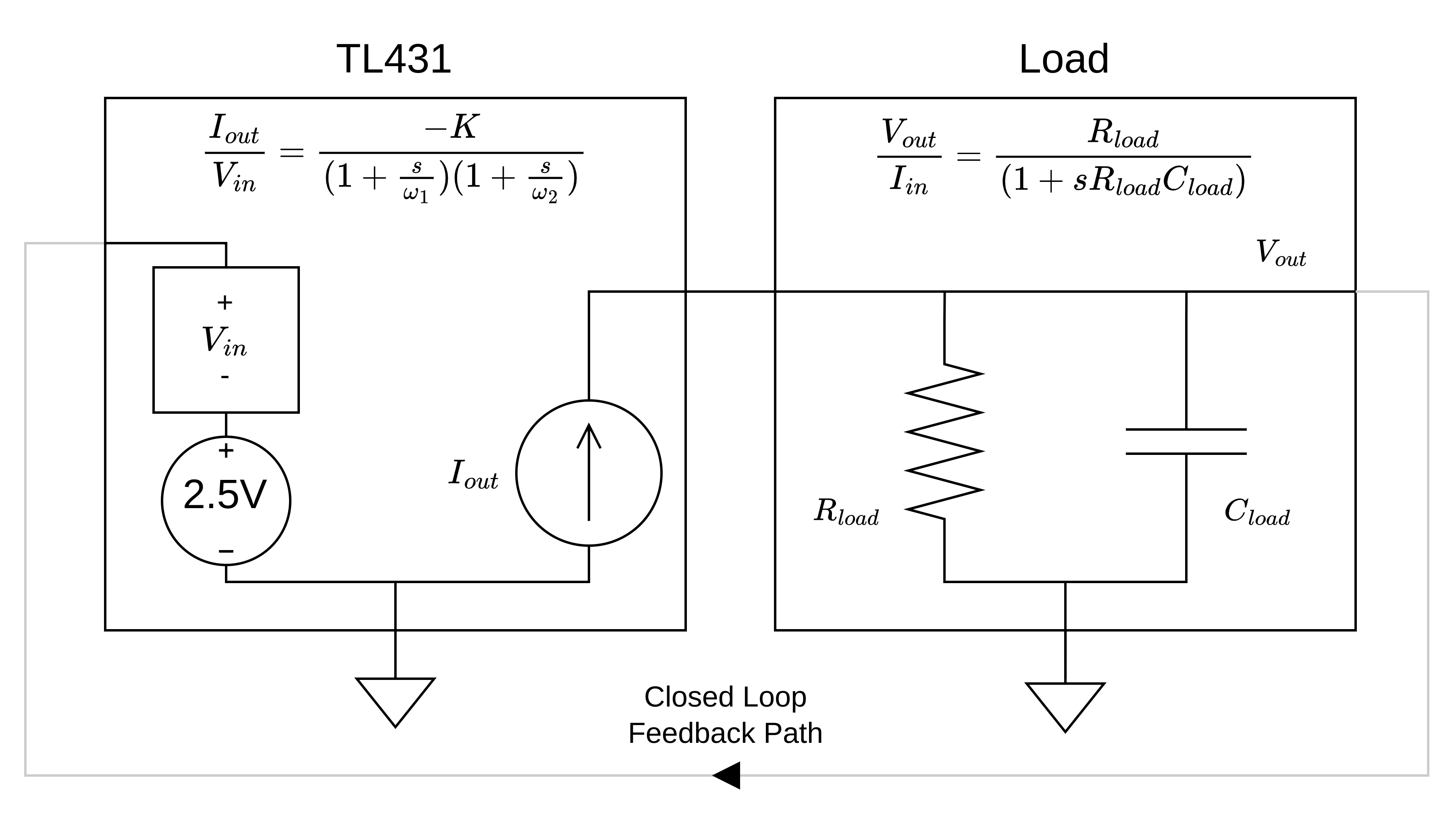 \[\text{TL431: } \frac{I_{out}}{V_{in}} = \frac{-K}{(1+\frac{s}{\omega_1})(1+\frac{s}{\omega_2})}\] \[\text{Load: } \frac{V_{out}}{I_{in}} = \frac{R_{in}}{(1+sR_{in}C_{load})}\] \[\text{System: } \frac{V_{out}}{V_{in}} = \frac{-K R_{in} }{(1+\frac{s}{\omega_1})(1+\frac{s}{\omega_2}) (1+sR_{in}C_{load})}\]